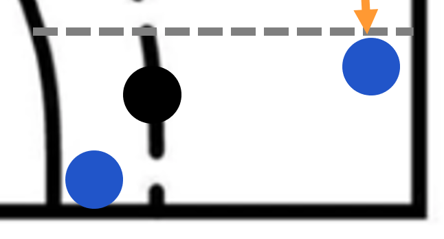 - The second player shifts the ball down towards a third blue player who begins a 2v1 along the baseline within the grey line