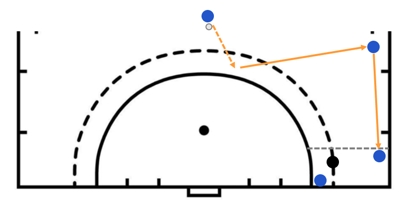 - The blue player starts with the ball just outside the 25. They then drive at the circle and roll to play a pass to a second waiting blue player around the 25 on the left