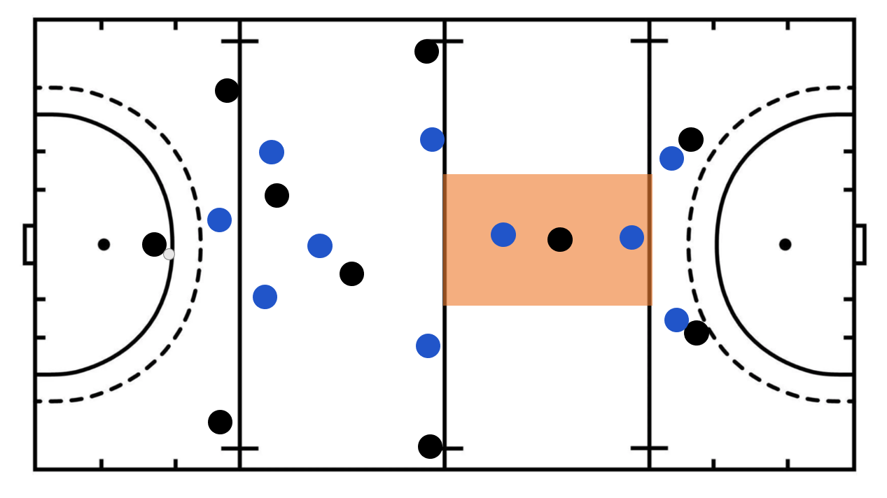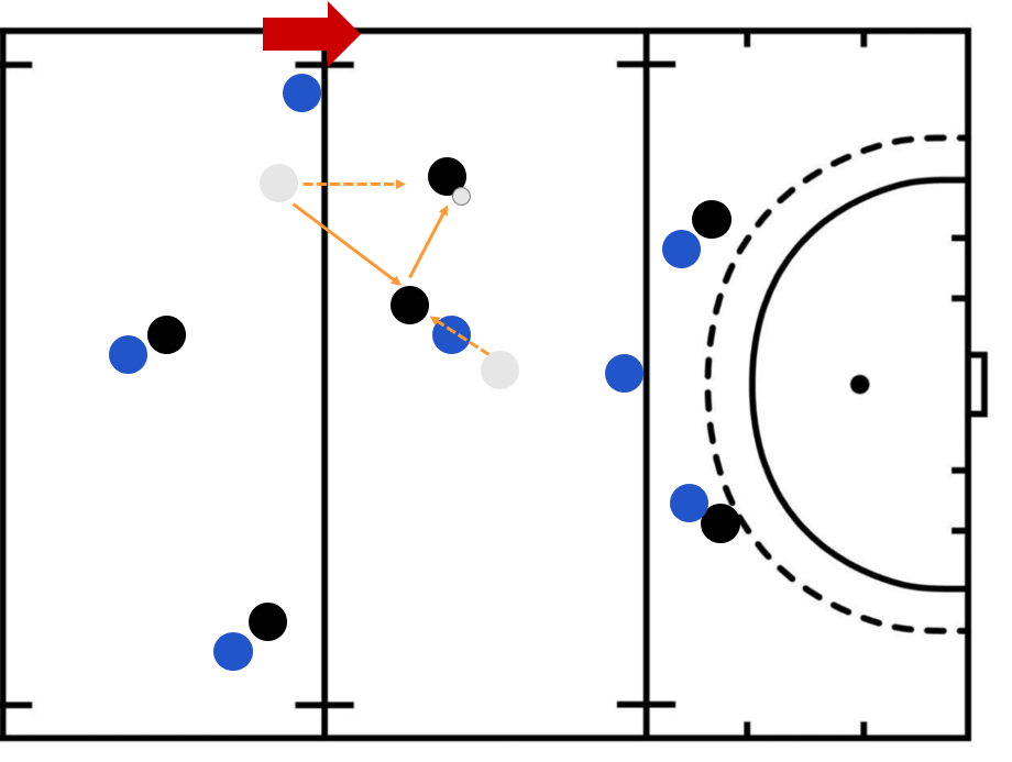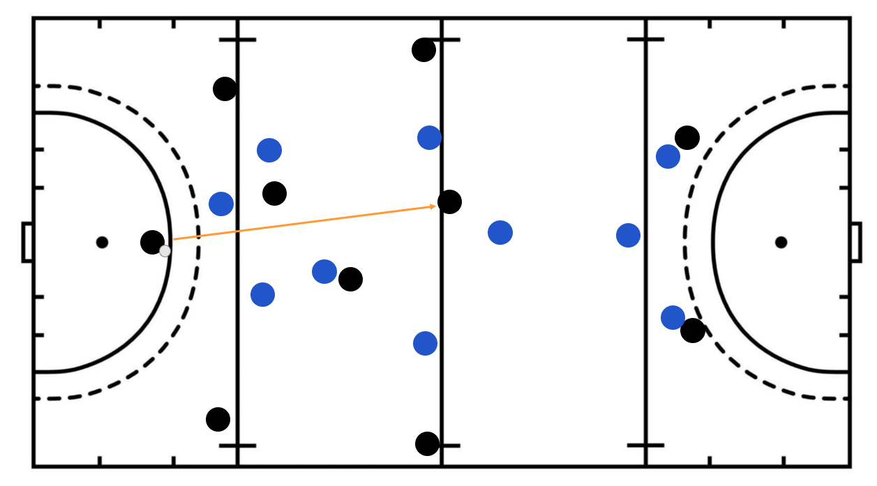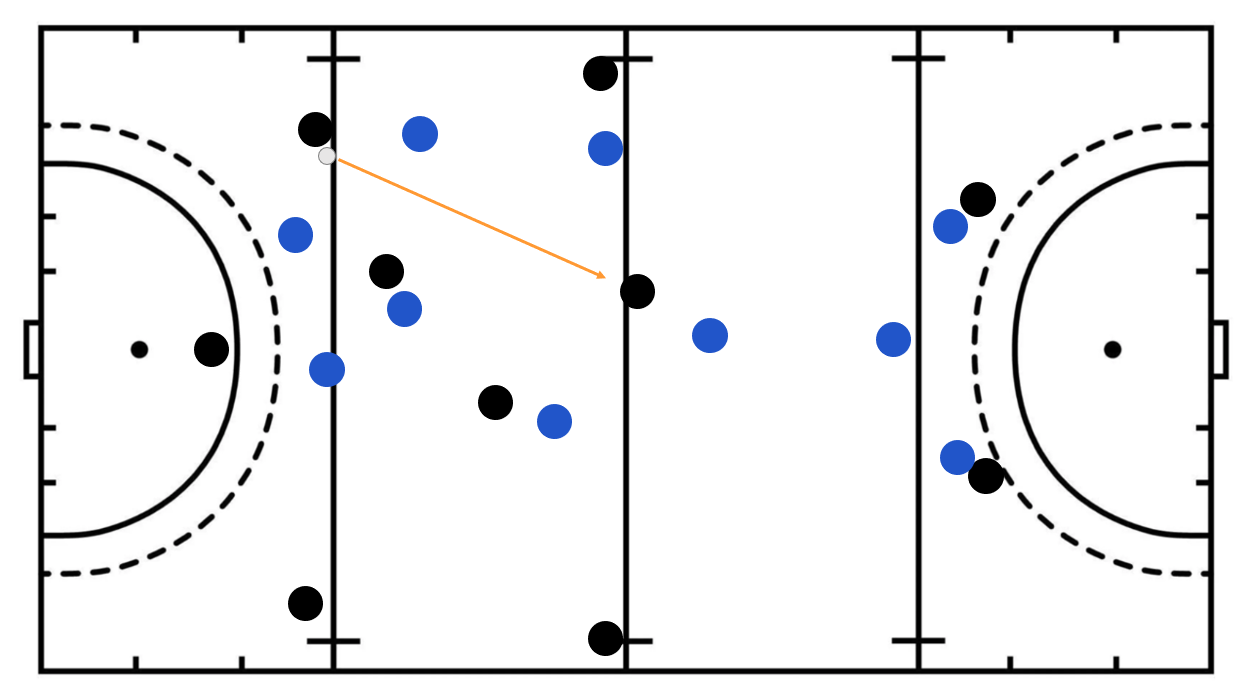 Occasionally, a poorly set press or a breakdown in the press after multiple back and arounds can lead to the opening of a direct pass to the Centre Forward