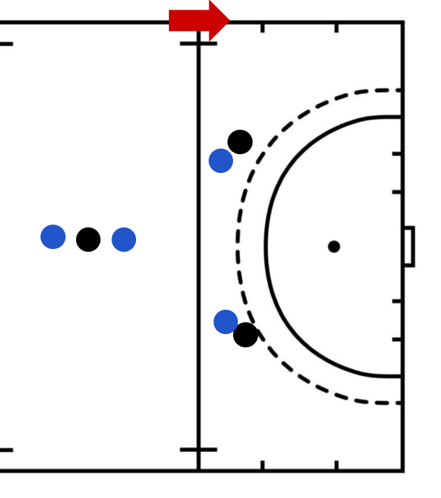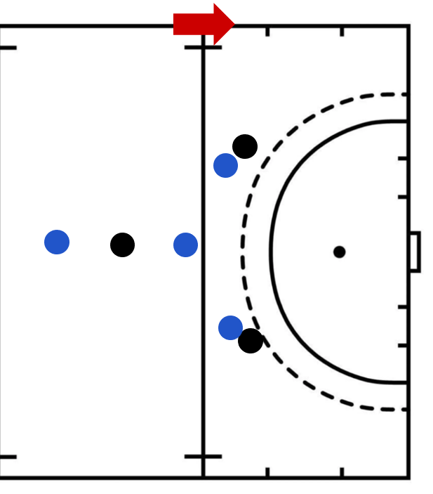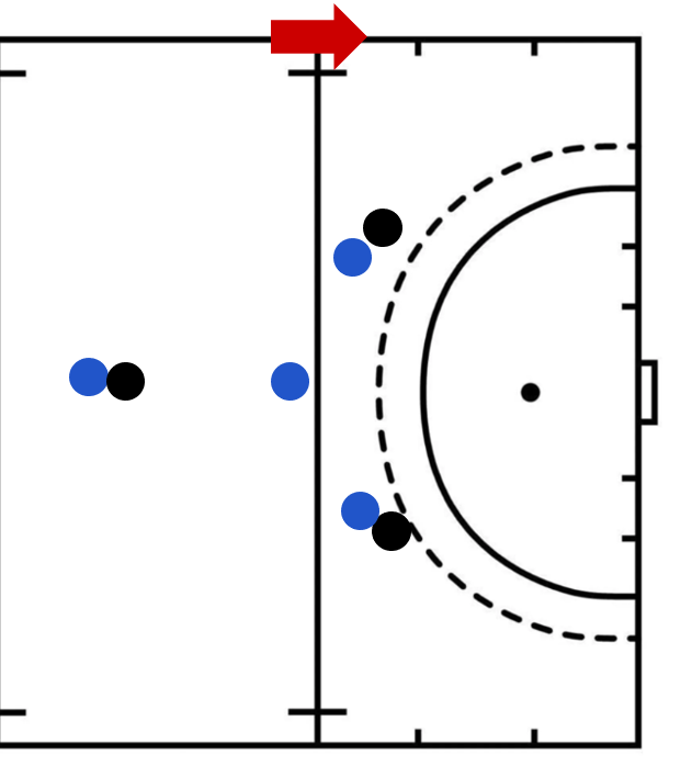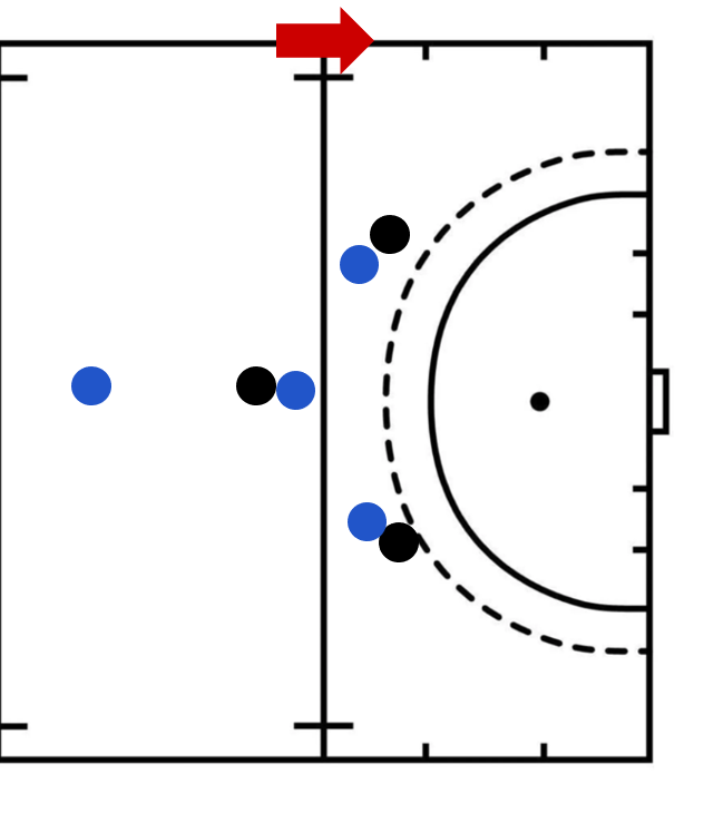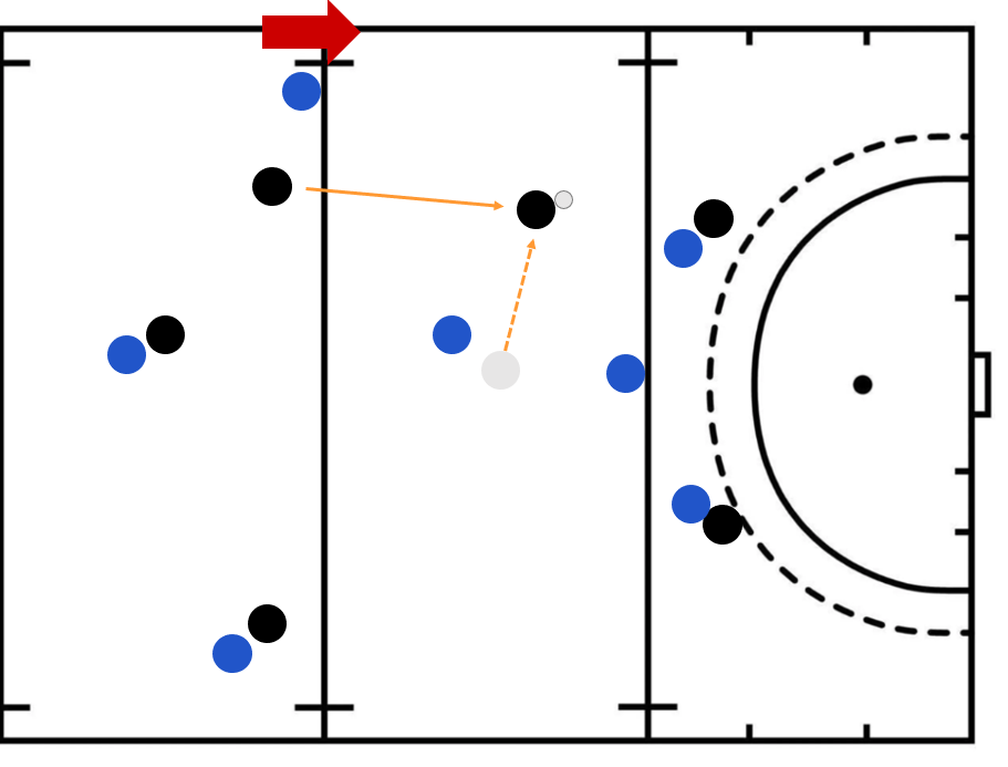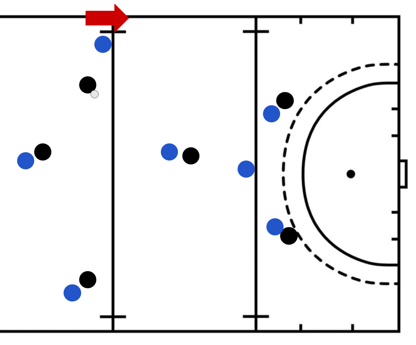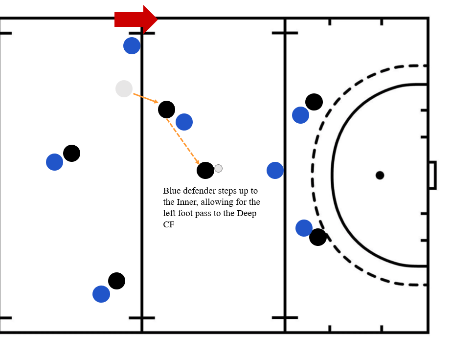 In image 1 (Left), we can see the blue team attempting a press on the outletting black team from a 16. Their press seems to be reasonably well executed and the black team's CB decides to pass to the Left Half. In image 2 (Right) the press adjusts and slides. However, mistakes/deception opens up a channel for a direct pass to the deep CF, who has led back in front of the blue team's free player to receive the ball. This pass may not be on straight away and only appear a few times a game but the threat of the pass forces the opposing team to accommodate by holding the middle. Thus, opening more space and time for the outside players.
