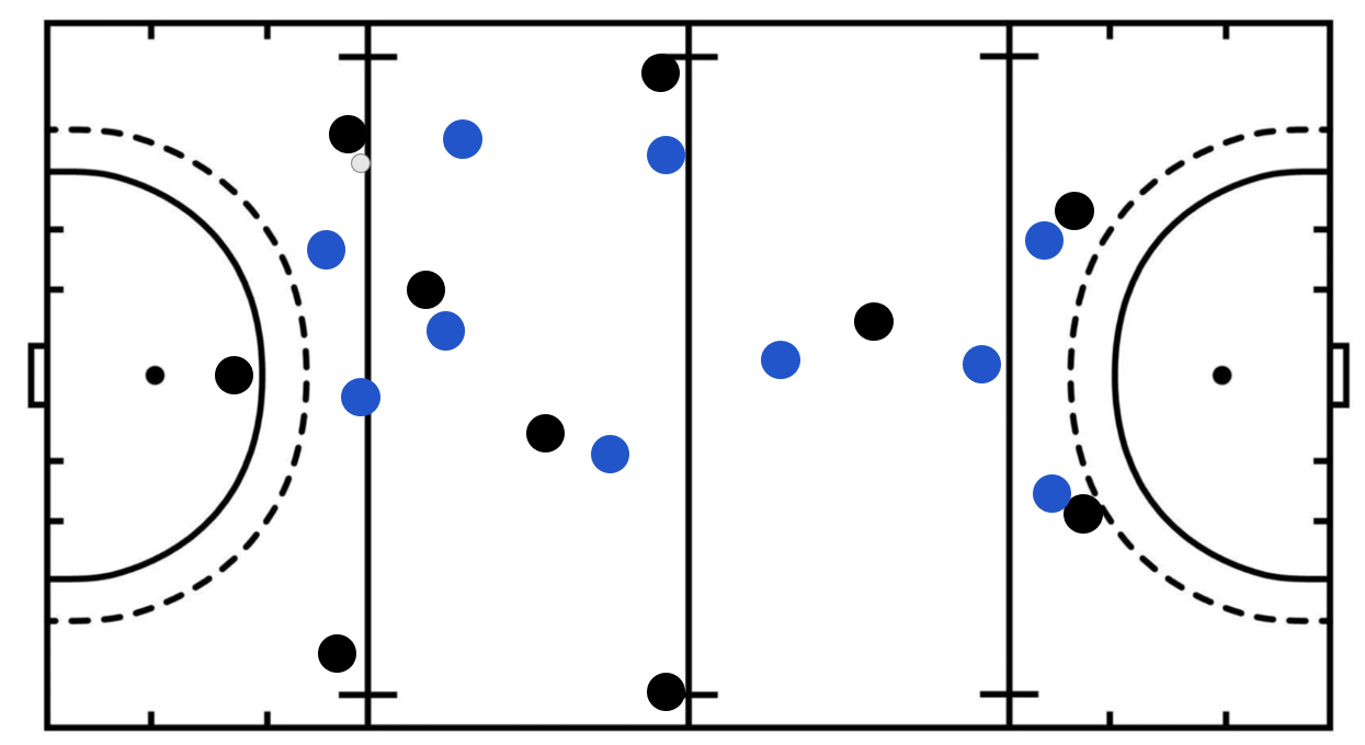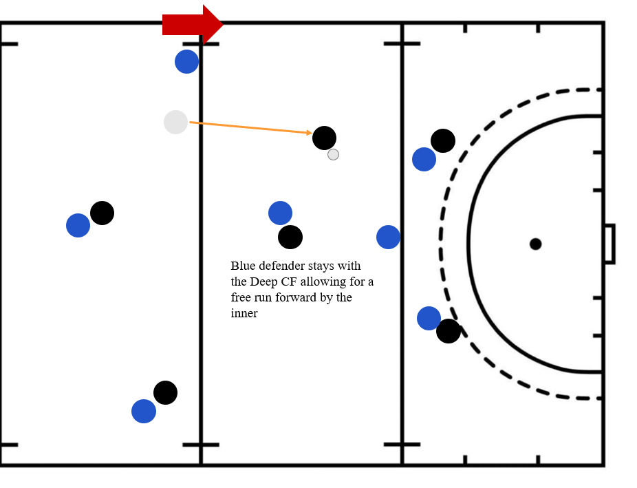 Often during games, we can find the midfield and striking line becoming quite disconnected as we try to maintain height to stretch the opposition but simultaneously stay connected ourselves. Playing with a deep CF can help with this and allow for the midfield to have a connection once they have breached the press. For an example see the image below.